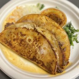 This is a great late night food spot! I thought I didn't like pupusas but theirs proved otherwise, the bread was light and crisp, with a nice amount of filling. The quesabirria tacos were also very nice, not too greasy! Then we also ordered a super quesadilla which got left out of our order on accident..but when we called to let them know, the man on the phone came and delivered it to use right away, I was very impressed by the service! The super quesadilla was worth the wait, so delicious! Definitely will be going back