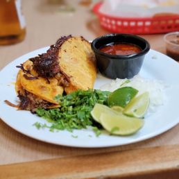 I ordered food for pick up; quesobirria, super burrito + asada meat, and a tres leches. 1. Quesobirria: soft meat fried steak taco that was dipped in birria sauce, flavorful birria (they add sauce/juice on the side for you to soak the taco in the sauce. Onions, parsley and lime are a must and complement this typical street food; highly encourage you to add them. 2. Super burrito w/carne asada: very compact big burrito, great flavor of all ingredients put together, but lacked flavor and excitement. Very fulfilling. 3. Not typical tres leches, peaches and a middle custard filling included 3.5/5 Overall food it was good, I'd come back for the quesobirria ($5) cheap too! Service was a bit behind when I showed up, it took them about 20-25 min to complete my order. The restaurant ambiance might not be fancy, it's a quick in and out restaurant. Some people selling clothes across the street